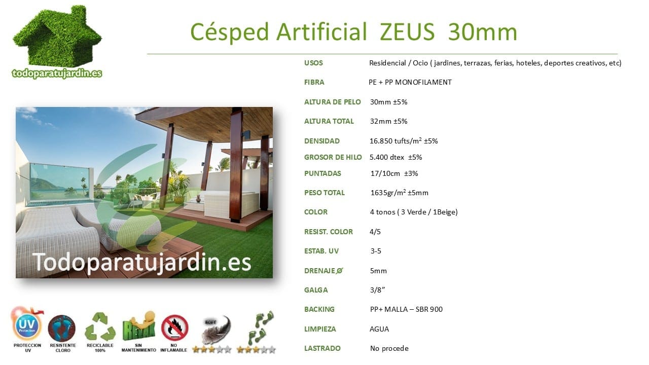 Dale vida a tu jardín con el césped artificial ZEUS 30mm, una opción versátil y resistente diseñada para combinar funcionalidad y estética en cualquier espacio al aire libre.