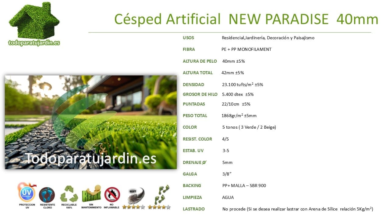 Cuando decides instalar el Césped Artificial 40mm Pelo Largo – Alta Calidad – Transporte Incluido: Césped Artificial NEW PARADISE 40mm: Calidad Superior al Mejor Precio🎖️ ✨, estás adquiriendo tecnología de vanguardia en jardinería sintética. Estas son sus especificaciones clave: