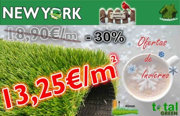 De la mano de las opiniones de los clientes más exigentes, traemos la nueva variedad de césped artificial de 45mm New York, con un acabado premium siendo el césped artificial barato 45mm con más calidad que se puede encontrar en la web.